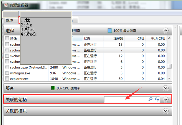3、打开“资源监视器”后,选择“CPU”,并在下面的“关联句柄”处输入你想进行操作的“文件名”。