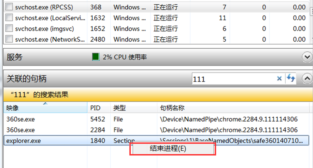 4、选择搜索出来的进程并“结束进程”,然后就可对该文件进行操作了。