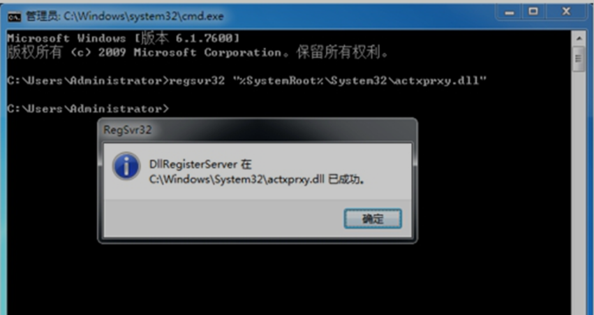 2)出现:DllRegisterServer在C:\WINDOWS\System32\actxprxy.dll已成功。