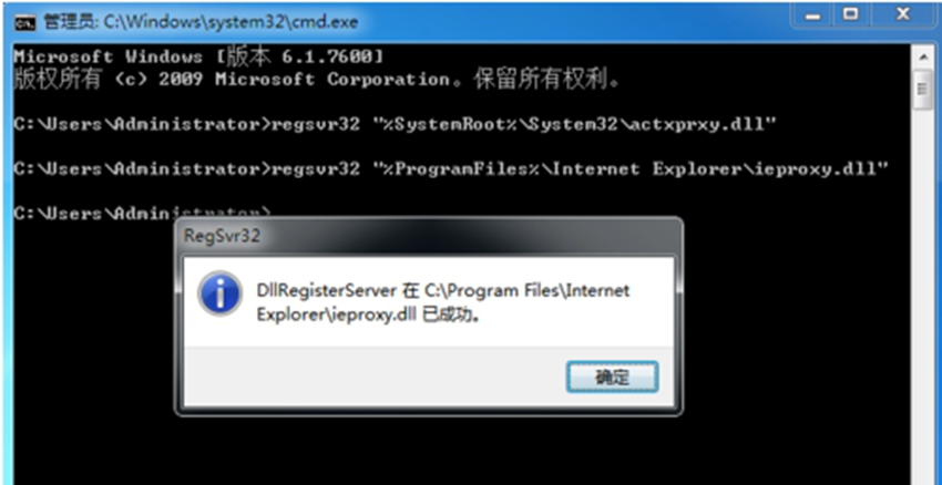 4、在命令行中再次输入:regsvr32 "%ProgramFiles%\Internet Explorer\ieproxy.dll"
