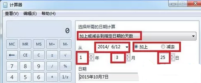 4、在窗口右侧选择“加上或减去到指定日期的天数”选项,选择好日期并选择好加上或减去的年数、月数和天数后,点击“计算”按钮,即可快速计算出结果了。