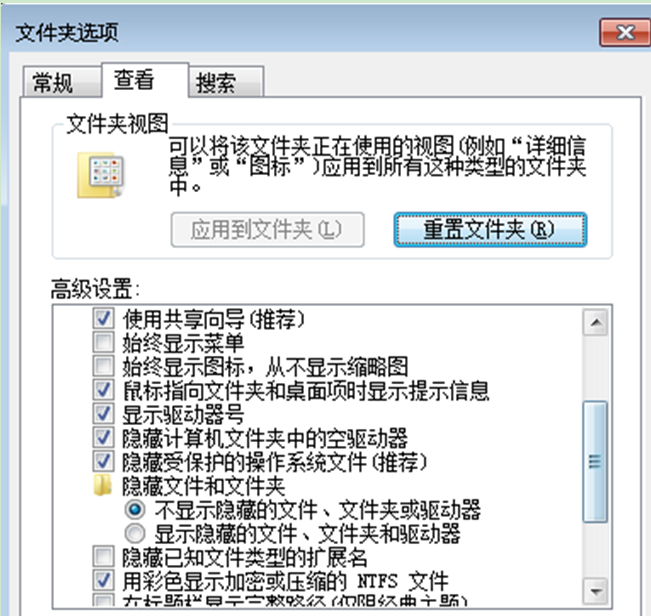 1、在文件选择项里边设置显示全部的文件,双击计算机图标进入计算机界面,点击上方的“组织→文件夹选项和搜索”,然后选中“显示隐藏的文件、文件夹...”选项。
