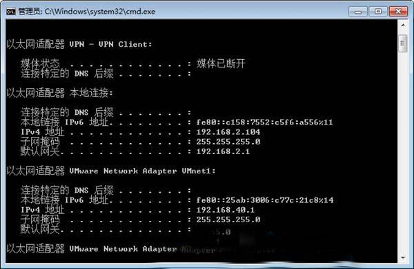 1、在雨林木风win7旗舰版系统中,点击任务栏左下角的“开始”——“运行”,键入“cmd”,单击“确定”,在打开的命令提示符窗口光标处输入“ipconfig”,按下“回车”键,查看IP地址是否正确。