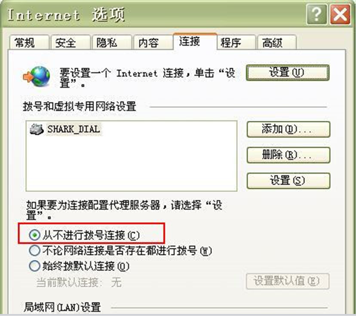 2、在“拨号和虚拟专用网络设置”栏中选中“从不进行拨号连接”单选按钮。