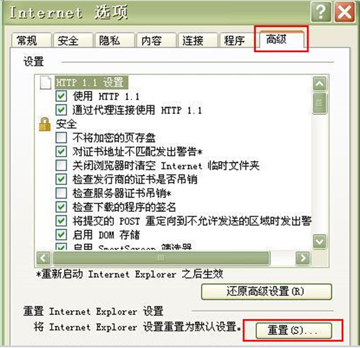 1、在打开的Internet选项中,切换到“高级”标签页,单击“重置”按钮,单击“确定”按钮。