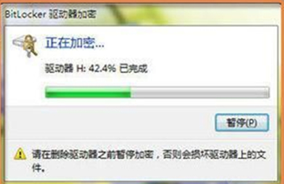 3、加密:点击“下一步”,进入“准备加密驱动器”窗口,单击“启动加密”按钮,Windows7开始对磁盘加密过程会显示进度,完成加密后会弹出提示窗口,会在盘符上出现小锁标志,如图示。
