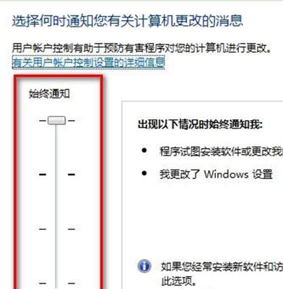 A、始终通知:对每个系统变化进行通知,任何系统级别的变化(windows设置、软件安装等)都会出现UAC提示窗口中。
