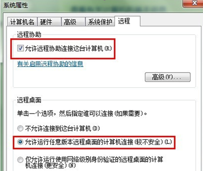 在弹出界面中,把“允许远程协助连接这台计算机”前面的勾选上,选中“允许运行任意版本远程桌面的计算机连接(较不安全)”。这样,被远程的计算机就已经设置好了,坐等别人远程就可以了。
