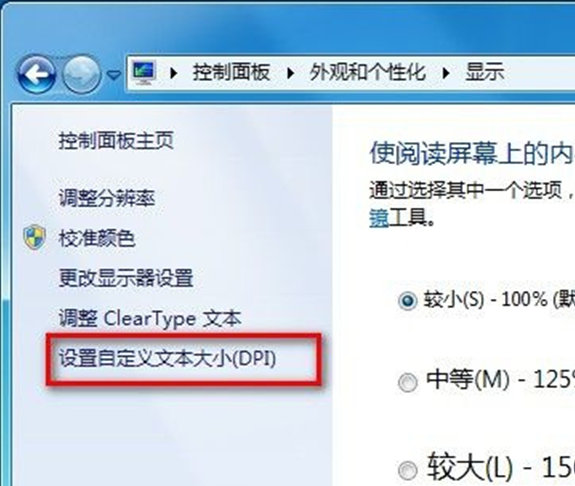 3、在显示窗口左侧,点击“设置自定义文本大小”。