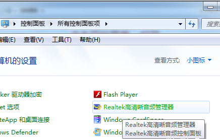4、以上都在排查是否“未插入”,通过桌面开始菜单,进入控制面板界面,点击进入“Realtek高清晰音频管理器”。