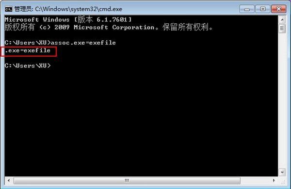 3、此时屏幕上显示“.exe=exefile”,关闭命令提示框并重启电脑。