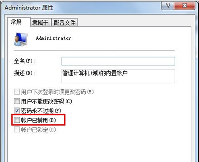 2.打开administrator属性中,在“常规”标签中将“账户已禁用”前面的勾选去掉后,确定保存即可。