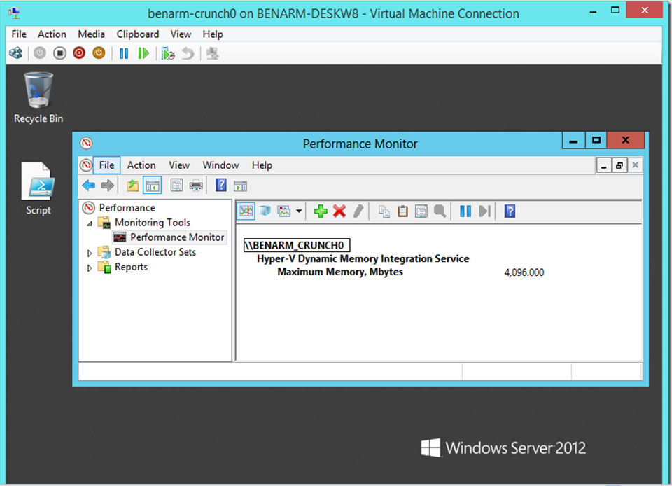 利用Performance Monitor,也就是通过Hyper-V Dynamic Memroy Integration Service的Mbytes性能计数器来查看Maximum Memory。