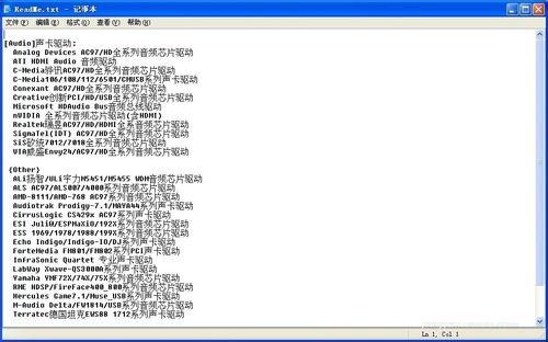7、打开自述文件,看一下自己的声卡设备型号是否在这里,万能声卡就是可尽量多的包含各个型号的声卡设备驱动程序,并能自动识别、安装。