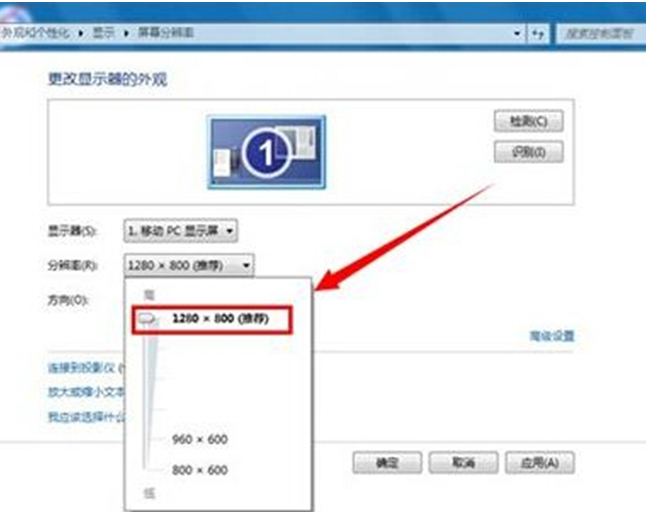 2、打开屏幕分辨率页面后,在分辨率设置的下拉窗口中,将分辨率调节到最高(推荐),然后点击“确定”按钮。