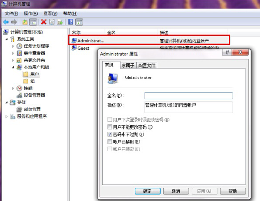 2.在打开的计算机管理界面,依次展开本地用户和组——用户,然后在右侧双击打开用户项下的“administrator”。