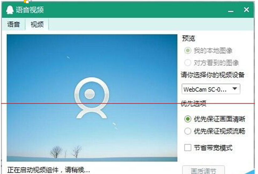 3、在打开的语音视频中,可看到正在启动视频组件,请你选择你的视频设备中,硬件表示摄像头