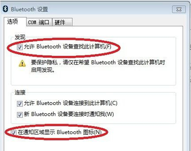 4、将“允许Blootooth 设备查找此计算机”和“在通知区域显示Blootooth图标”这两个选项前面的勾选上,最后点击“确定”。
