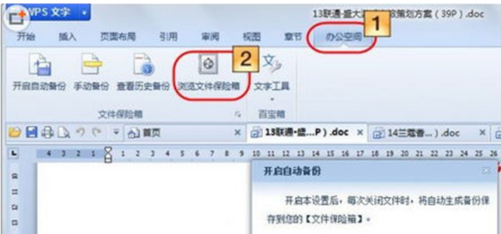 1、打开一个WPS文档,点击“办公空间”——“浏览文件保险箱”,输入WPS通行证。然后点击“开启自动备份”按钮,设置所有文件都开启自动备份。