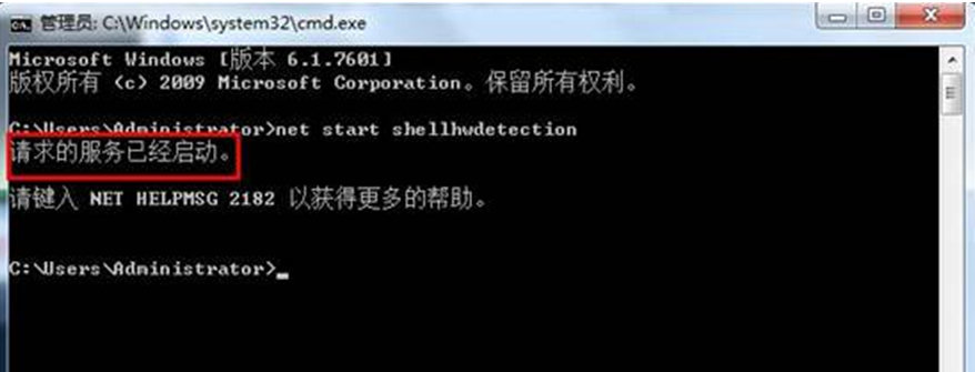 2、在弹出的命令提示符窗口光标处输入“net start shellhwdetection”命令后按回车执行。