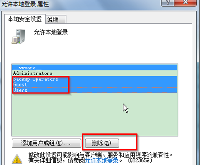 3、接着出现“允许本地登录属性”面板,只留住“Administrators”用户,把其它的用户都删掉。