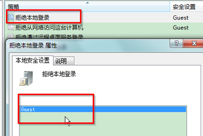4、返回“用户权限分配”面板,双点开启“拒绝本地登录”选项,把“guest”用户删掉便可了。
