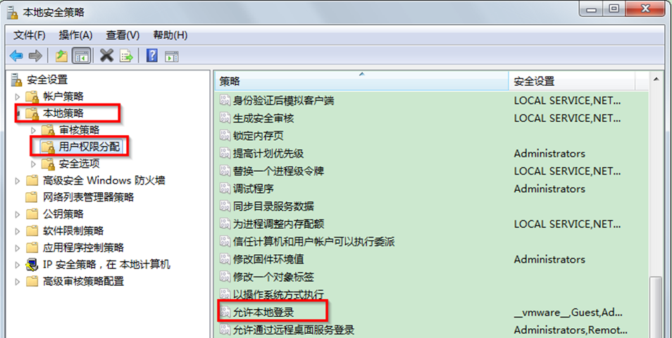 2、在弹出的“本地安全策略”框中,点选“本地策略”——“用户权限分配”项目,再在右边选项卡中点选“允许本地登录”键值。