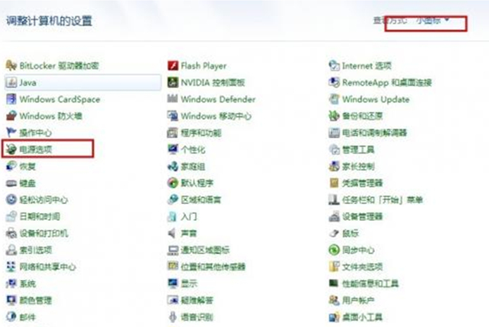 1、点击“开始——控制面板——切换到小图标模式下点击电源选项”。