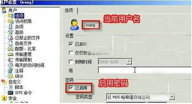 2、点击新建立的“域”下方的“用户”,修改“Anonymous”帐户名称,双击这个当前用户名,再设置启用一个密码即可,这样服务器就设置完成了,如图示。