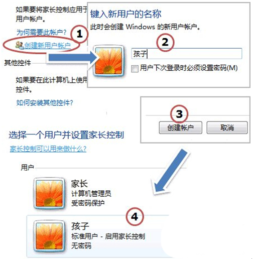 2、弹出家长控制对话框里,点击左介的创建新用户帐户。然后在弹出的创建用户窗口,键入新用户的名称孩子,并点创建帐户按钮即可完成。创建了一个叫做孩子的用户供孩子使用,此时计算机就有一个是您作为家长的管理员账号,另一个叫做孩子的账户则是给您的孩子使用。
