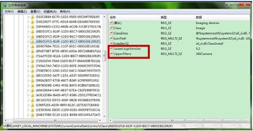 3、点击{6BDD1FC6-810F-11D0-BEC7-08002BE2092F}键值,并在右侧窗口删除 Upperfilters 值和 Lowerfilters 值。当然,如果没有这个键值的话,就暂时不要修改,有的话就请删除掉。