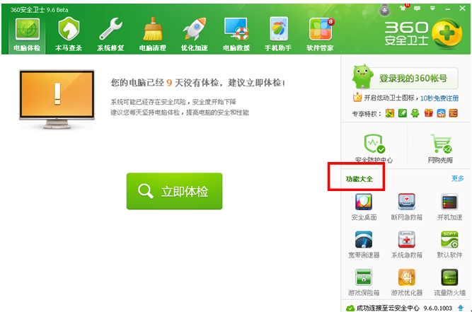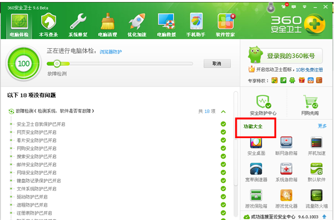 步骤一:打开360安全卫生,找到功能大全标签,然后打开。
