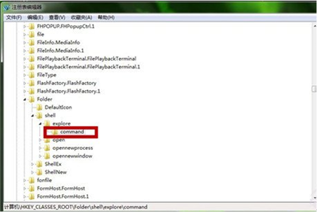 2、 在打开的“注册表编辑器”窗口中,依次找到并点击以下注册项HKEY_CLASSES_ROOT\Folder\shell\explore\command。