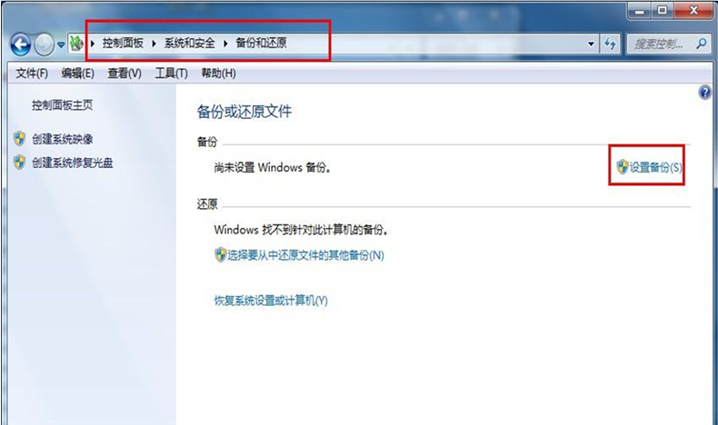 1、依次点击打开“开始——控制面板——系统与安全——备份与还原”,在打开的备份与还原窗口中选择“设置备份”。
