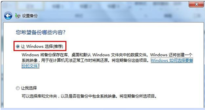 4、备份的方式有两种, “让windows选择”相当于默认, “让我选择”相当于自定义。用户可以根据自身的需要进行选择,小编这里演示的是“让windows选择”,然后点击“下一步”;