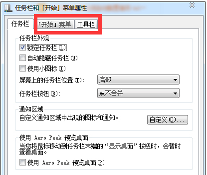 2、然后在“任务栏和【开始】菜单属性”界面中选定“【开始菜单工具栏”。