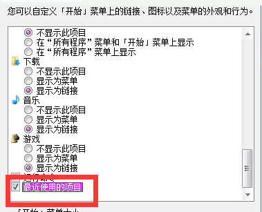 4、拉去下拉键到最下面,勾选上“最近使用的项目”选项,再点“确定”就OK了。
