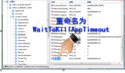 1、开启注册表,点开HKEY_CURRENT_USERControl PanelDesktop,再在右边框中空白区域右击点选“新建”建立个“DWORD 32位值”。再将其重命名为“WaitToKillAppTimeout”文件。