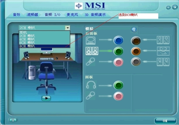 1、在声卡设置界面中选择“音频I/O”,将“2CH喇叭”改为“8CH喇叭”,这样设置可有效解决游戏内声音小的问题。