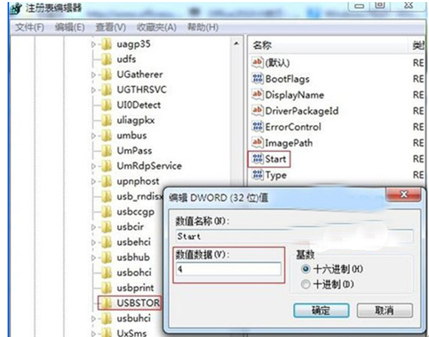 2、在“注册表编辑器”中依次展开:“HKEY_LOCAL_MACHINE\SYSTEM\CurrentControlSet\services \USBSTOR”,在右侧窗口中找到并双击“Start”,将其默认值“3”修改为“4”确定即可。
