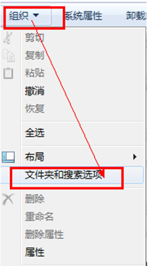 1、按“win+E”组合键打开资源管理器,然后点击组织按钮并选择文件夹选项,如图: