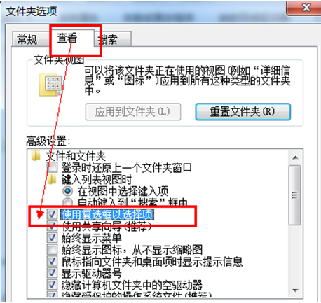 2、弹出“文件夹选项”对话框,切换到“查看”页面后勾选“使用复选框以选择项”,并确定。