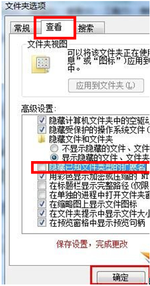 在菜单中打开“控制面板”,然后在控制面板的选项中选择“文件夹选项”,在文件夹选项中切换“查看”选项。然后拖动进度条到最下端,将“隐藏已知文件类型的扩展名”这一项前面的勾取消,最后点击“保存”。