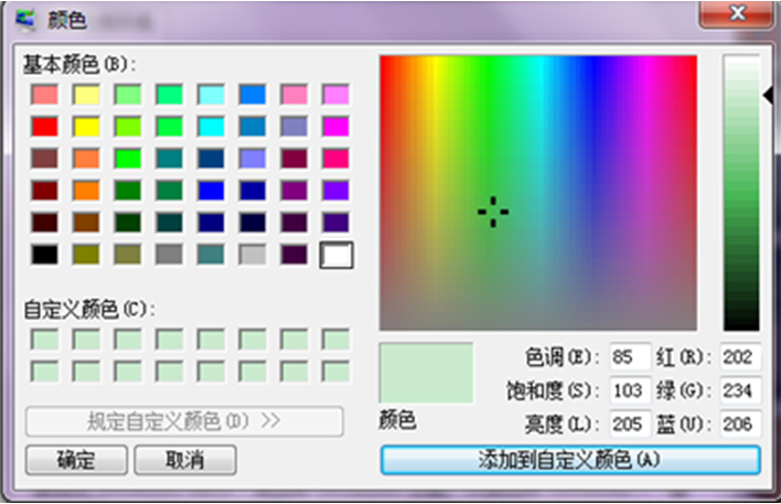 3、色调设为85、饱和度设为123、亮度设为205,单击 添加到自定义颜色,然后点击确定。