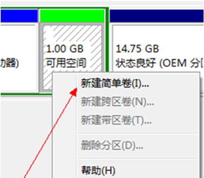 4、压缩后会发现多出一块 未分区磁盘(绿色分区),右键弹出快捷菜单选择“新建分区”