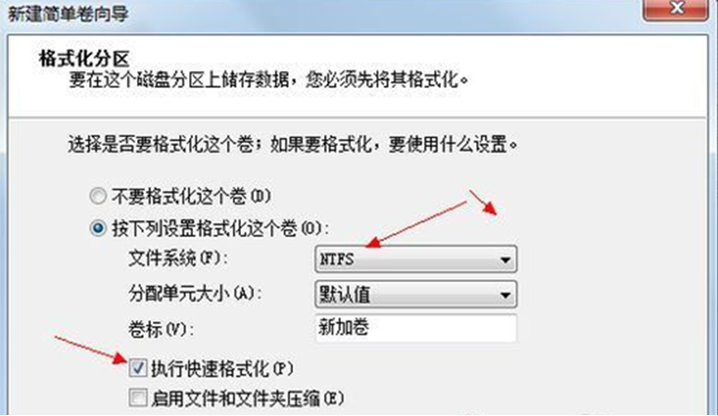 7、选择文件系统格式,然后在执行快速格式化前打钩,点击“下一步”。