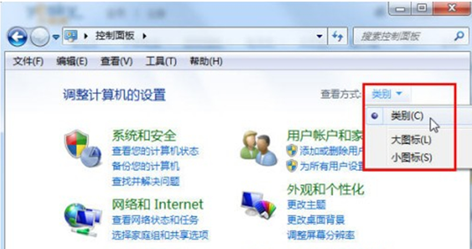 3、Win7查看方式的应用技巧。Win7系统的控制面板是以“类别”形式来显示功能菜单,分类为系统和安全、用户账户和家庭安全、网络和Internet、外观和个性化、硬件和声音、时钟语言等,每个类别又有各自的的具体功能类型,另外还提供了“大图标”和“小图标”的查看方式,只需点击控制面板右上角“查看方式”旁边的小箭头,就可以从中选择自己喜欢的形式,非常方便。