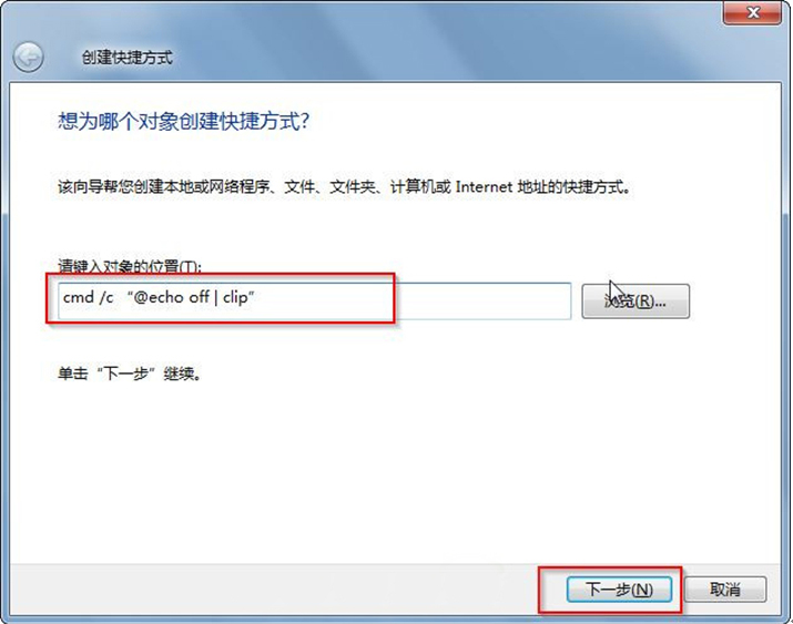 1、在桌面空白处右击“新建——创建快捷方式——请键入对象的位置”输入:cmd /c “@echo off | clip” 后点击“下一步”按钮(注意:“/”这个符号的左边需要空一格,“|” 这个符号的左右两边都需要空一格,c和“之间需要有一个空格,这些符号都要在英文输入法状态下输入,而且建议手动输入,不要复制粘贴) 如图示: