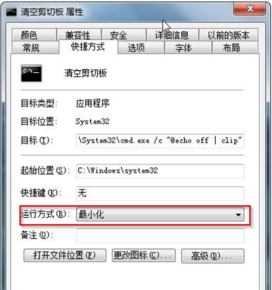 3、如果用户审美观很强的话,为了“清空剪切板”界面的运行美观,可打开“清空剪切板”快捷方式的属性界面,将“运行方式”设置为“最小化”。