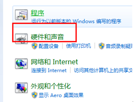 然后点击硬件和声音选项,如图: